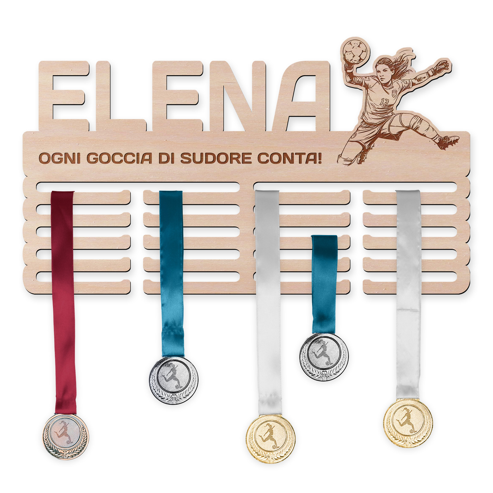 Realizziamo appendi medaglie su misura secondo i tuoi desideri. Basta fornire il nome, una frase motivazionale e la silhouette sportiva e noi ci occupiamo del resto.